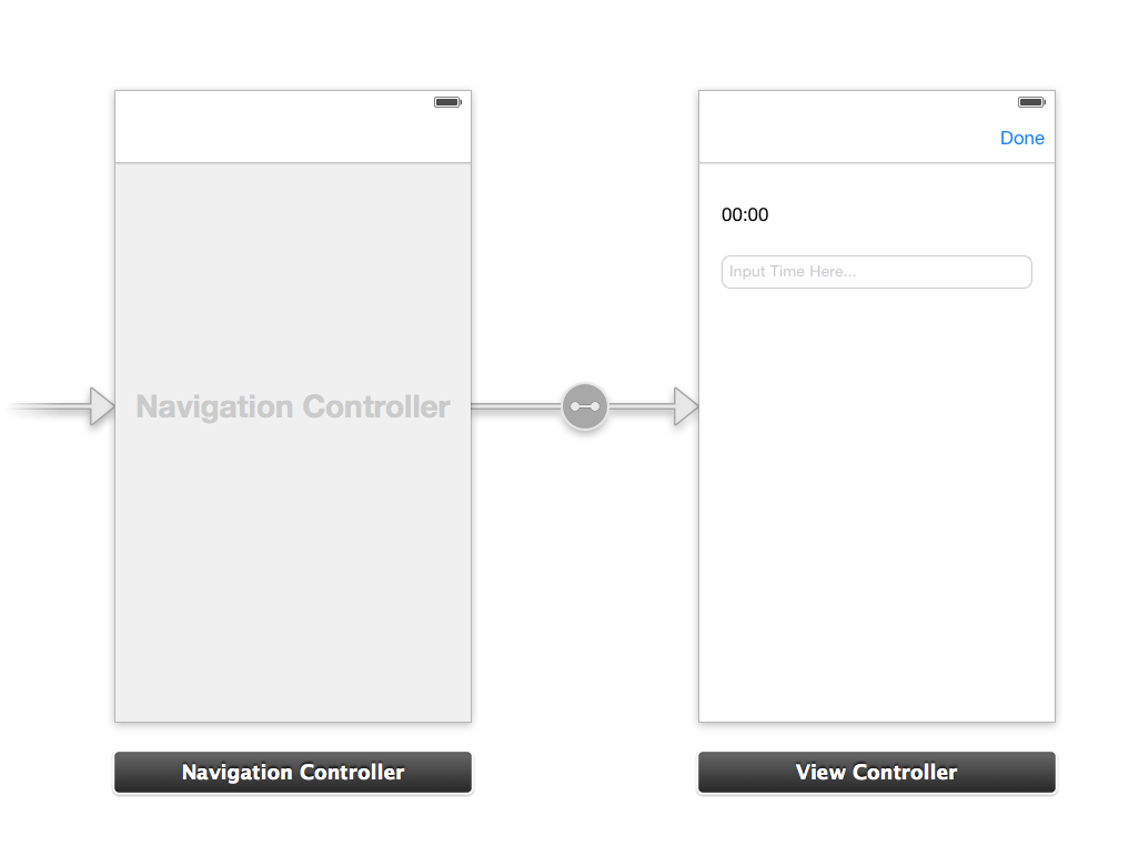 Next, let's add a bar button item, a label, and a text field. I configured the bar button item to have a title of "Done". I also changed the label text to "00:00" and textfield's placeholder to "Input Time Here".
